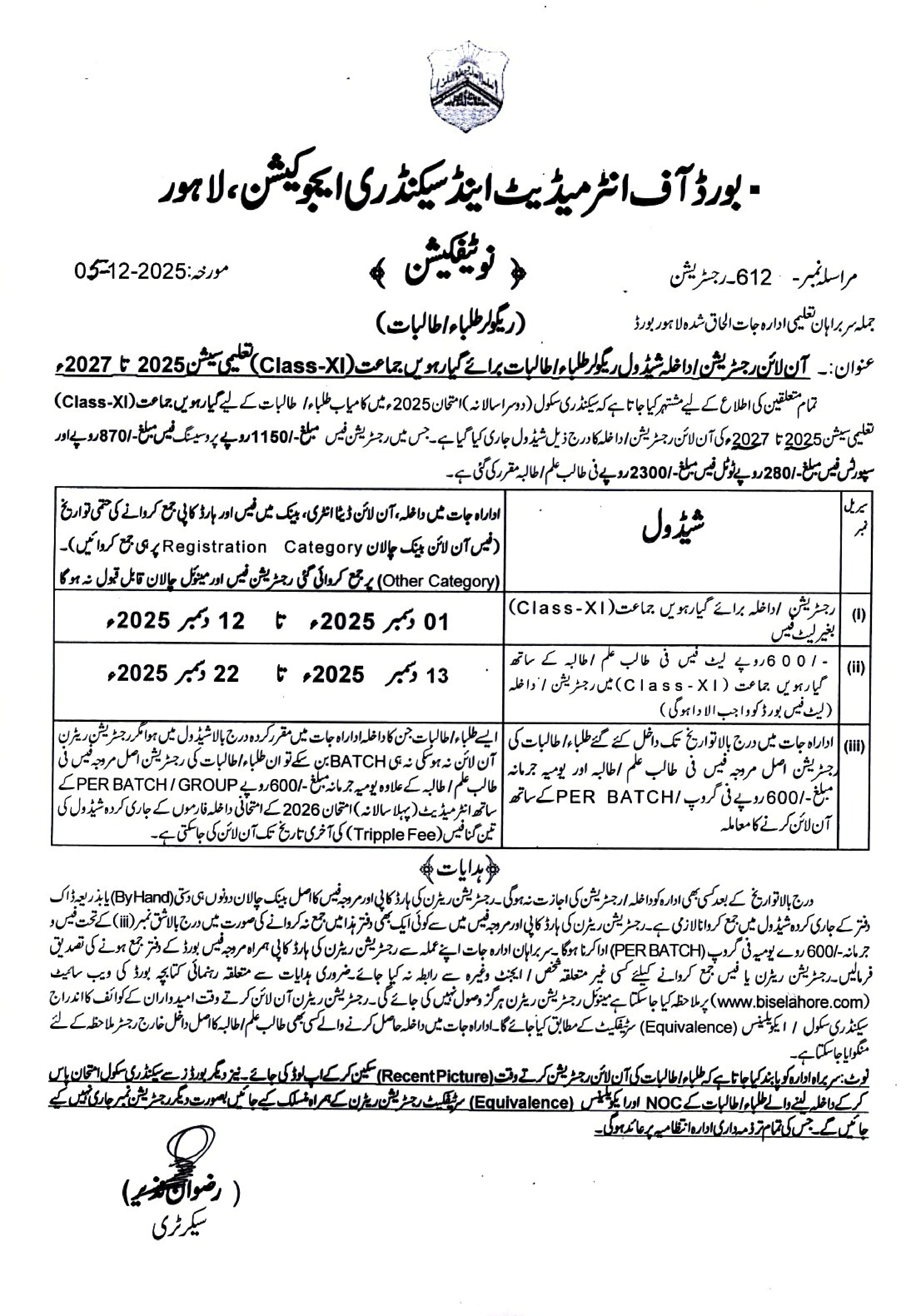| Intermediate Class 11 Registration (With Single Fee) | 10-10-2022 | Check Schedule | Check Here |