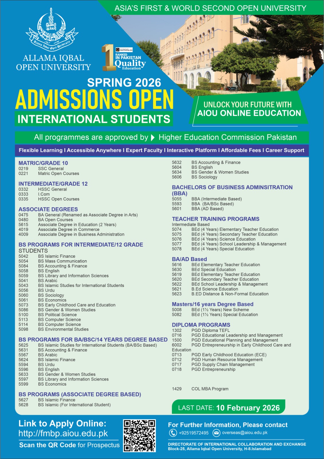 Allama Iqbal Open University (AIOU) has announced admissions for the Spring 2026 semester. The deadline for admissions in Matric, FA, AD, BS, BEd, PGD & Certificate Courses (Fresh) are February 10th, 2026.