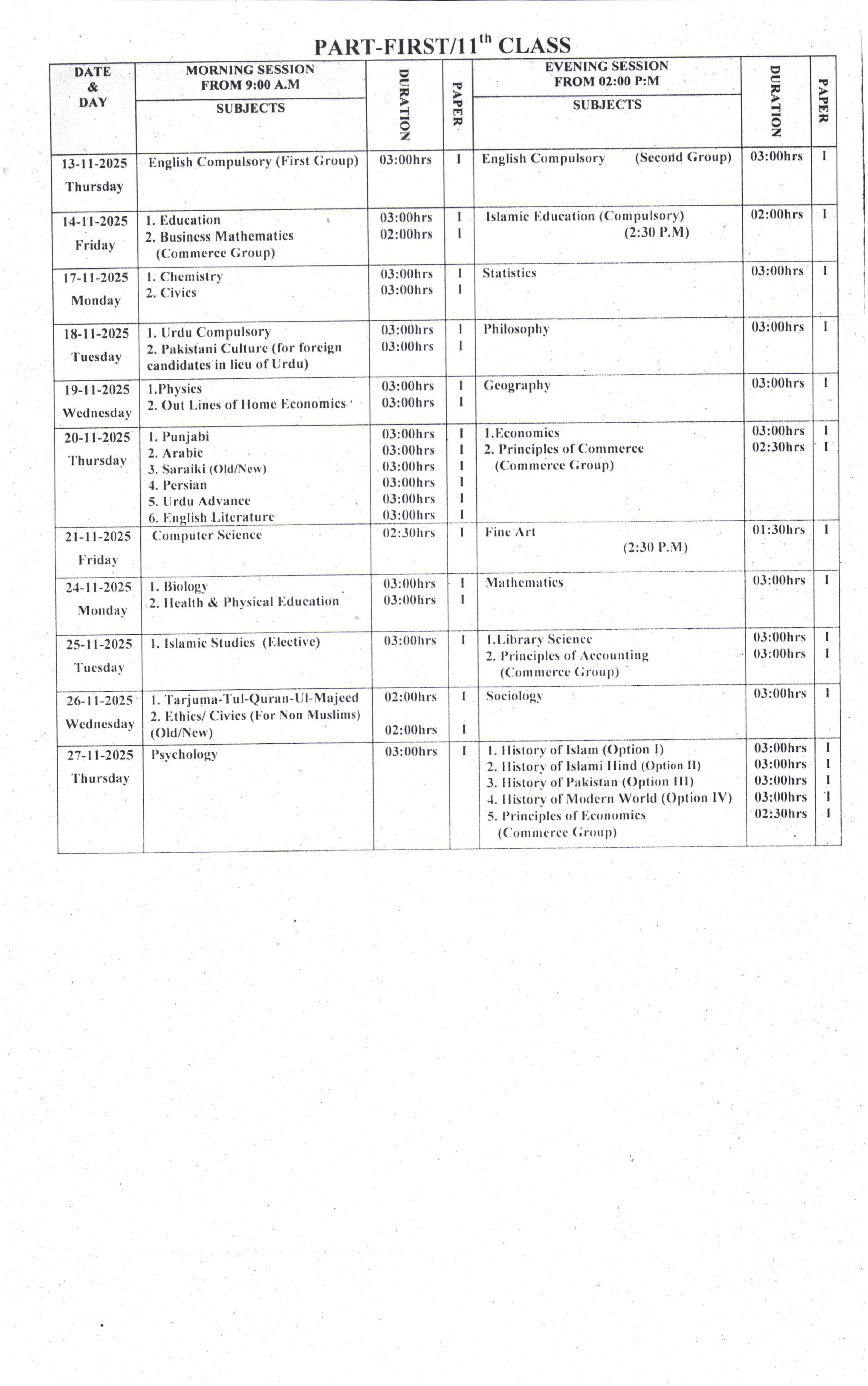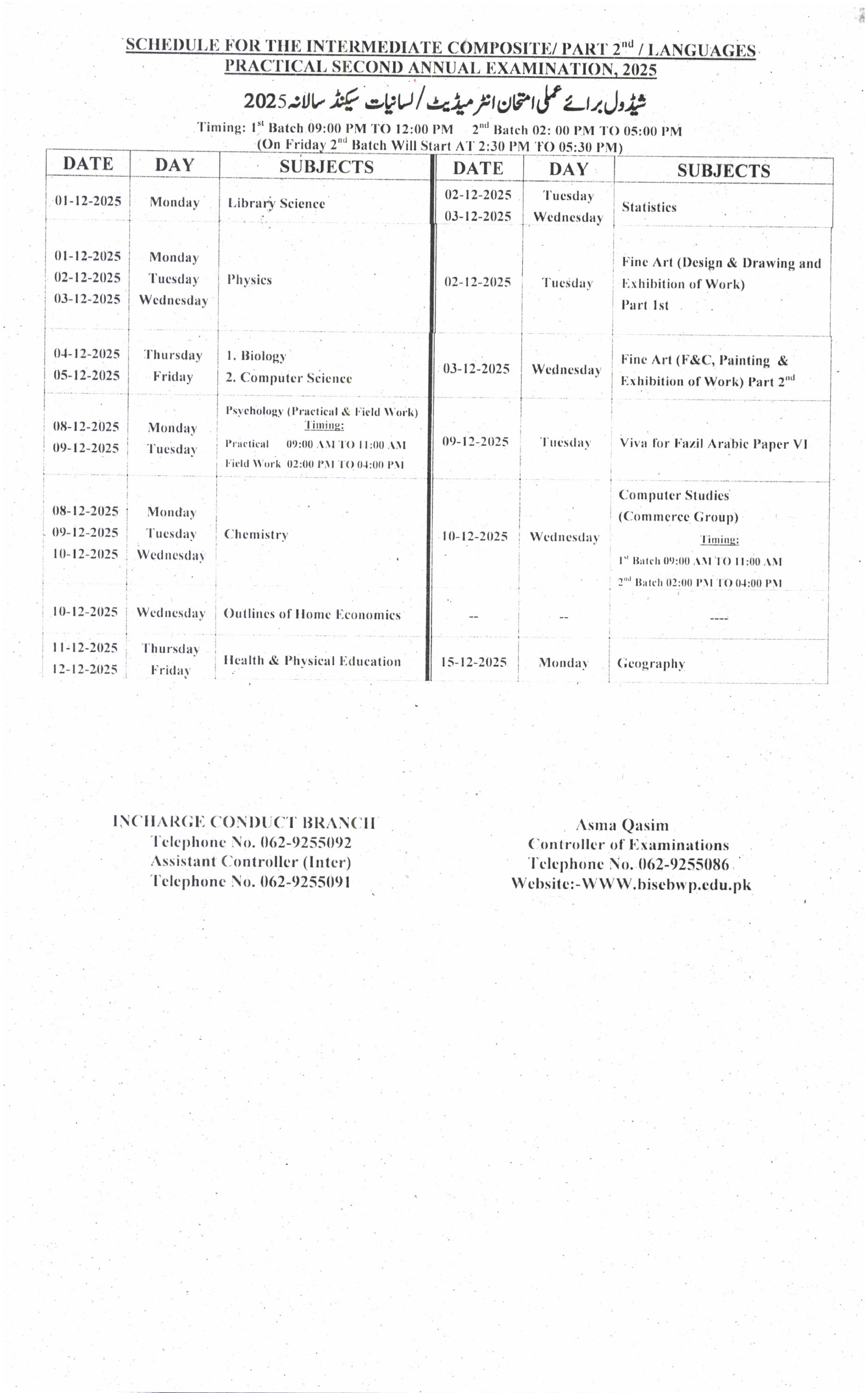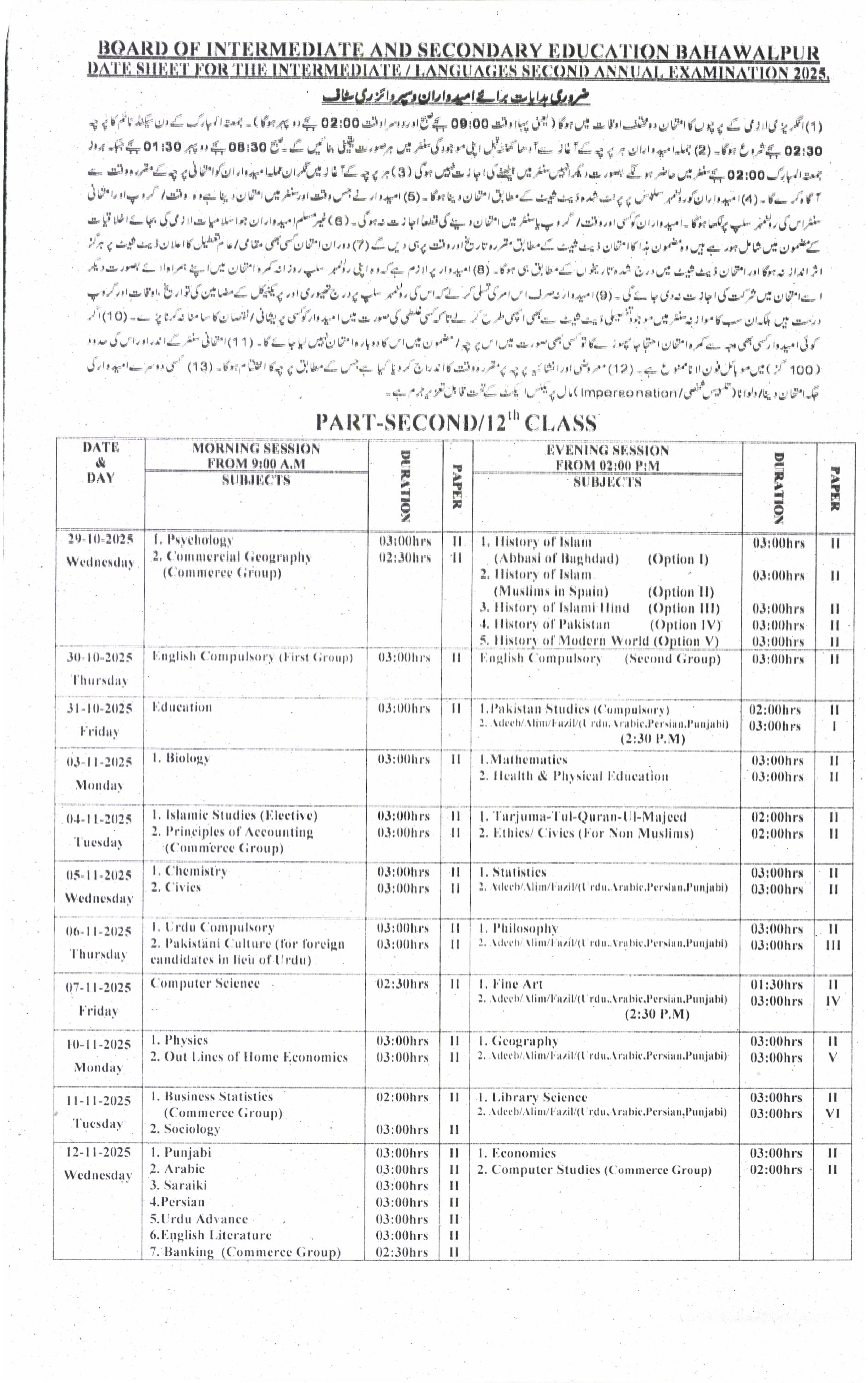 • The Bahawalpur Board Inter Part 2 Date Sheet 2025 2nd Annual has announce in October, 2025.