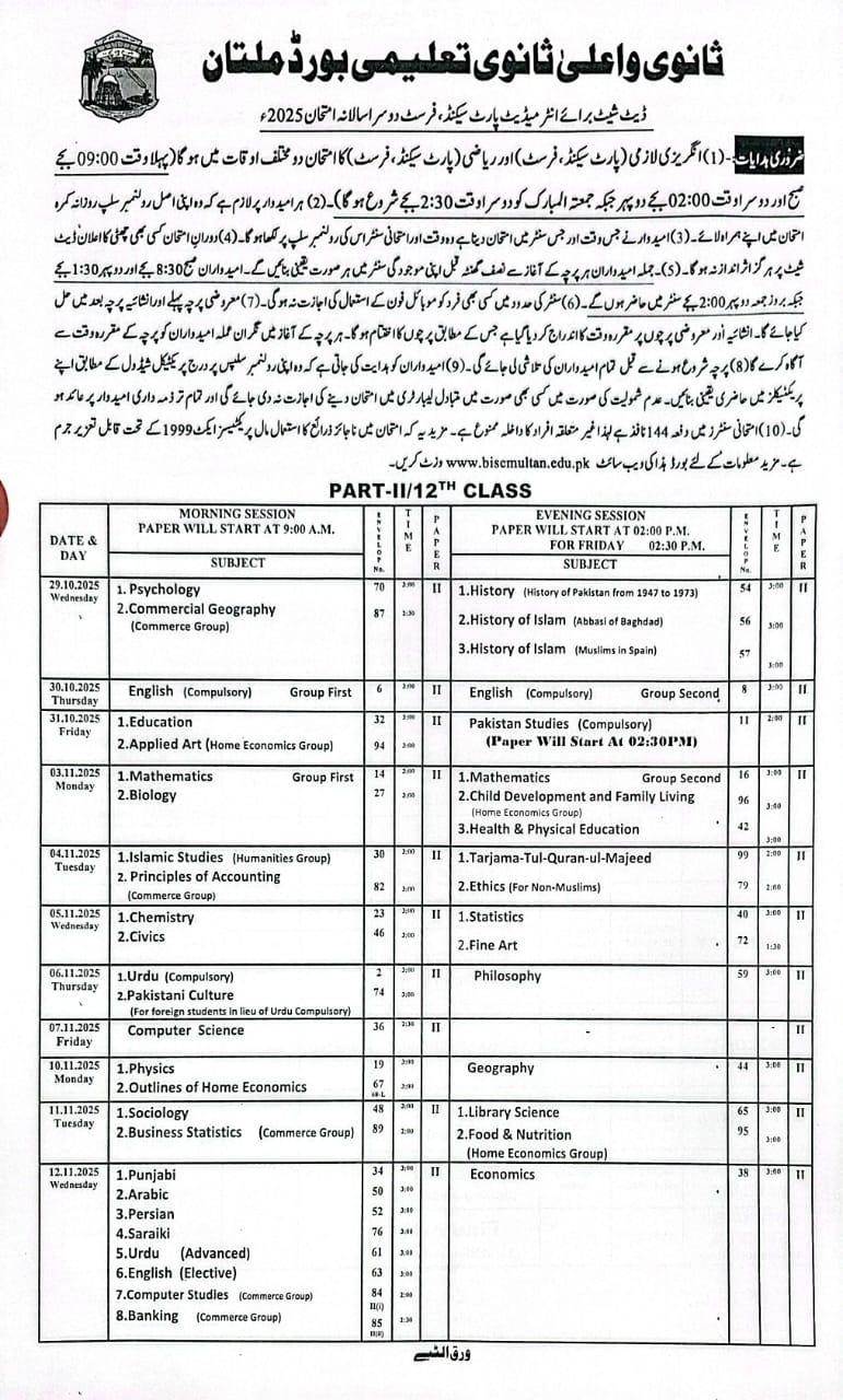 • The Multan board has announce the 2nd Annual Date Sheet 2025 for 11th class students in October, 2025.