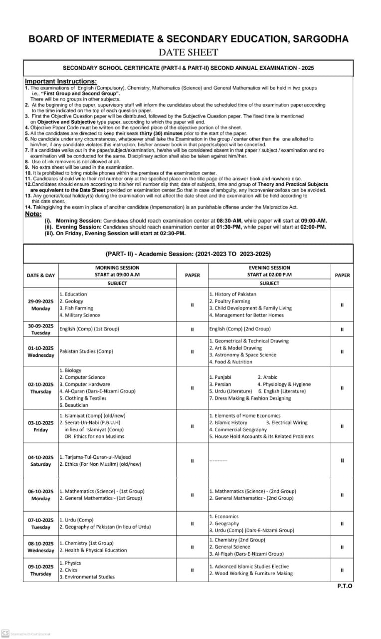 • The 10th Class 2nd Annual Date Sheet 2025 Sargodha Board has announce on September, 2025.
