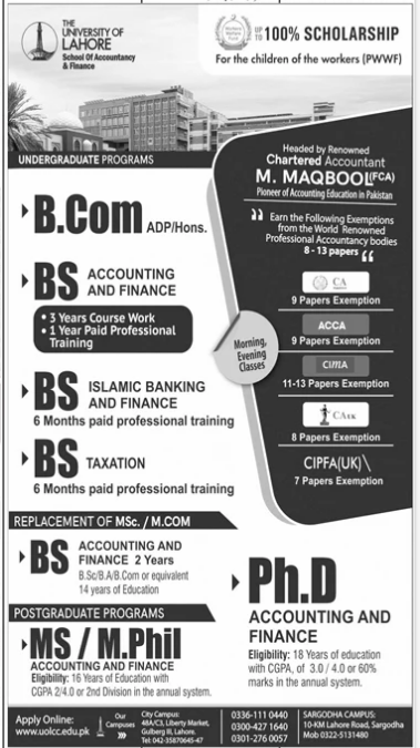 The University of Lahore’s School of Accountancy & Finance has opened admissions in the following undergraduate programs: