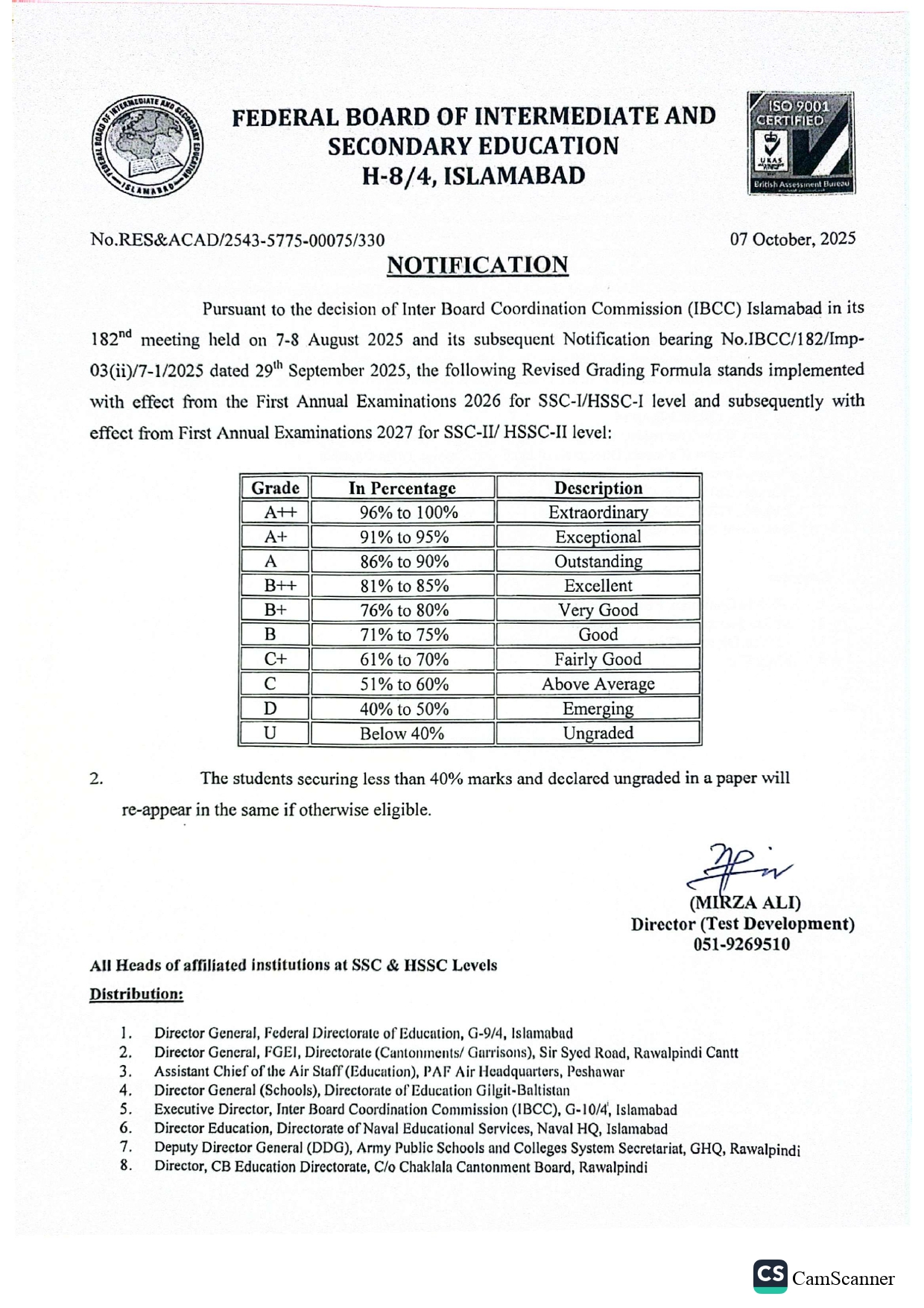 According to the official notification, the decision was made after comprehensive consultation with the Inter-Board Coordination Commission (IBCC), which reviewed grading and assessment criteria across all educational boards in Pakistan. The move aims to enhance the quality of education, ensure better academic standards, and bring Pakistani evaluation methods in line with international education systems.