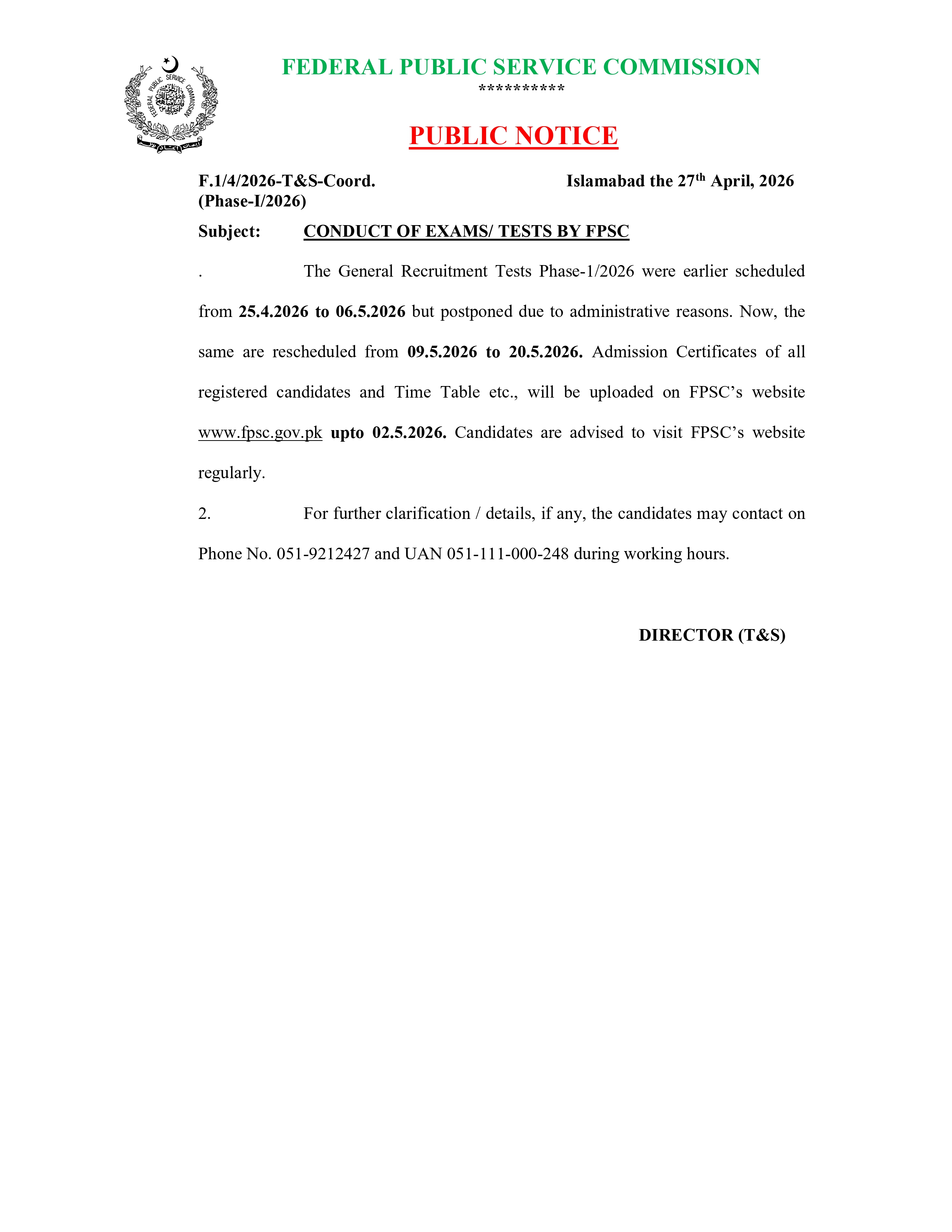 The Federal Public Service Commission (FPSC) has officially announced a new schedule for its previously postponed General Recruitment Tests Phase-I/2026, bringing clarity to thousands of waiting candidates across the country. In a public notice issued on April 27, 2026, the Commission detailed the adjusted timeline, citing administrative reasons and external security arrangements linked to the United States-Iran Peace Talks hosted in Islamabad.