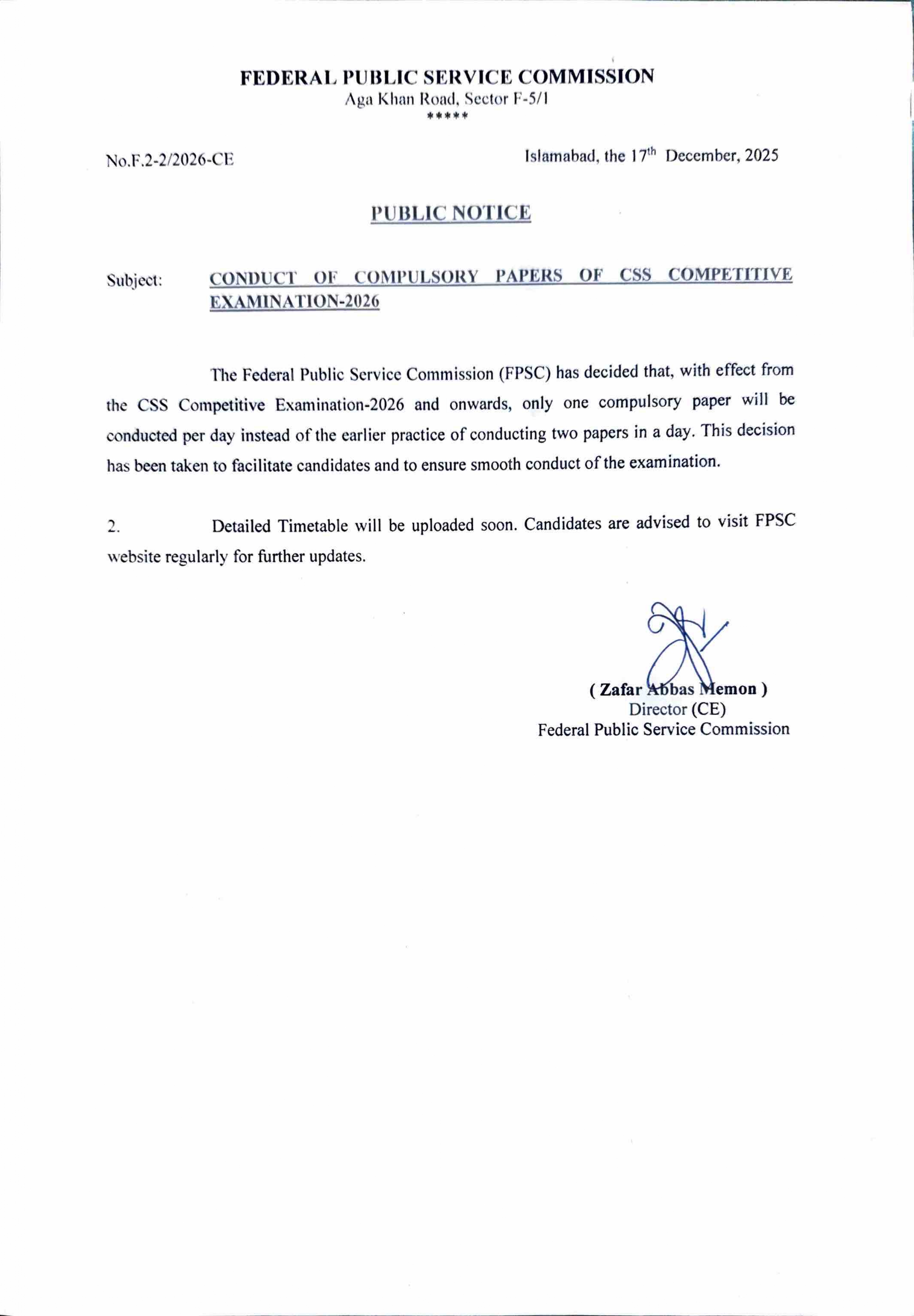 The official public notice , numbered F.2-2/2026-CE and issued on December 17th, 2025 , from the FPSC headquarters in Islamabad , marks a pivotal shift in the administration of one of Pakistan's most prestigious competitive exams. The notice, signed by Director (CE) Zafar Abbas Memon, states that the decision is effective immediately for the CSS Competitive Examination-2026 and will be the standard protocol for all future examinations.