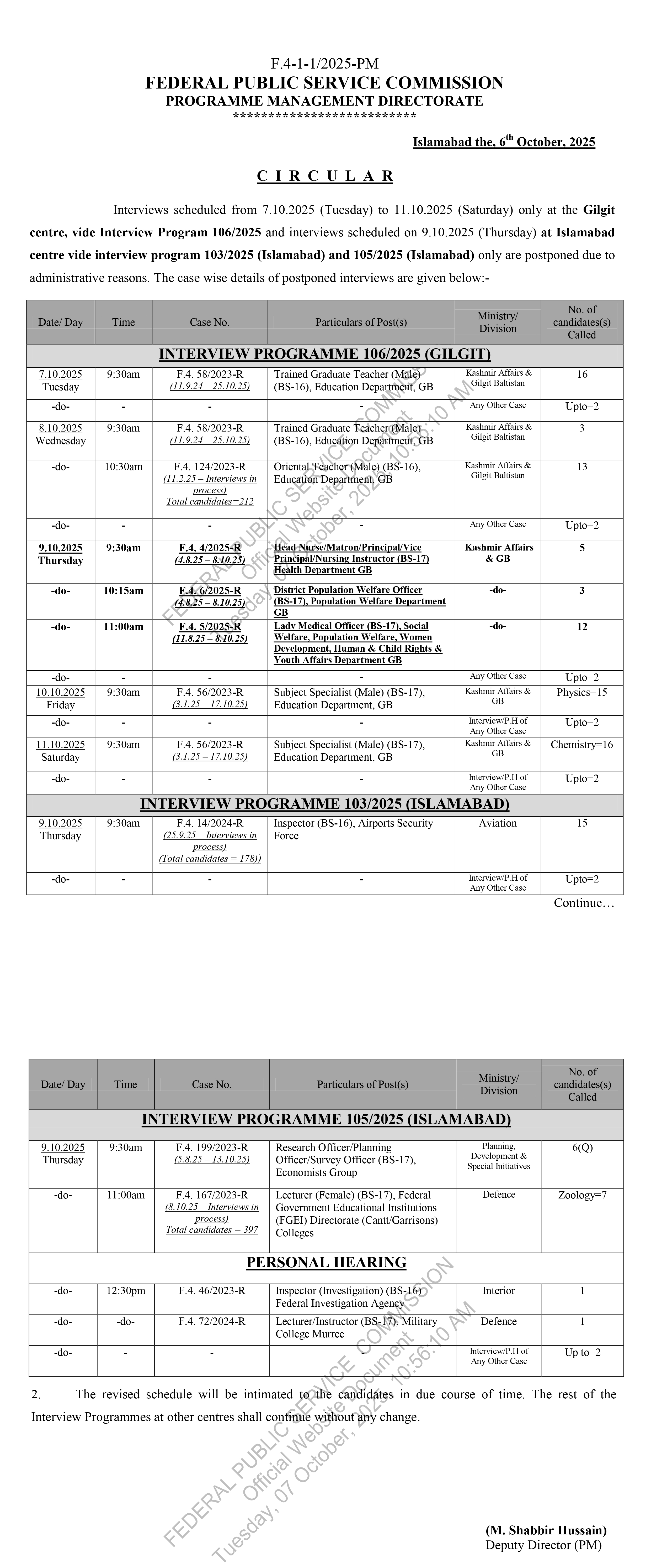 The Federal Public Service Commission (FPSC) has officially announced the postponement of several scheduled interviews under Interview Program Nos. 106/2025 (Gilgit), 103/2025 (Islamabad), and 105/2025 (Islamabad) due to administrative reasons. The circular, issued by the Programme Management Directorate (PMD) on October 6, 2025, details the affected interview programs and assures candidates that revised dates will be communicated soon.