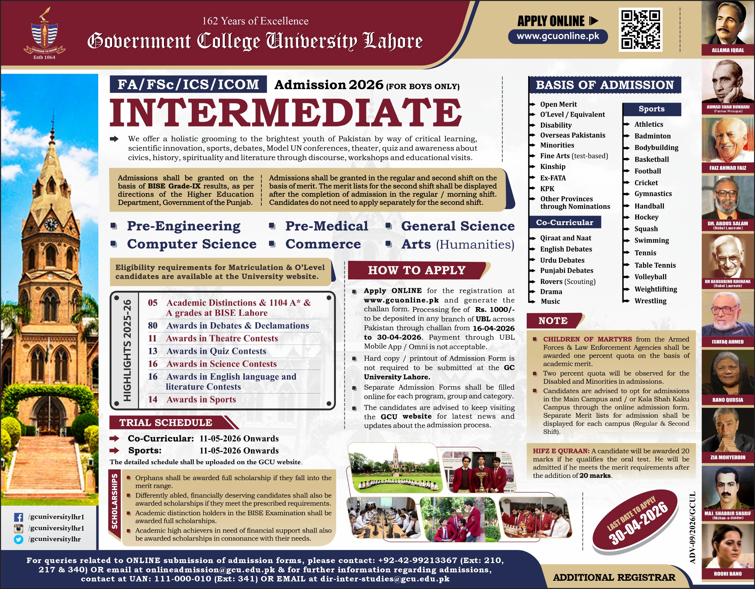 University officials have urged all candidates to visit the official GCU website to complete their forms before the April 30 deadline. With the digital system now live, the administration expects to process applications faster than ever before, setting a new standard for intermediate admissions in Punjab.