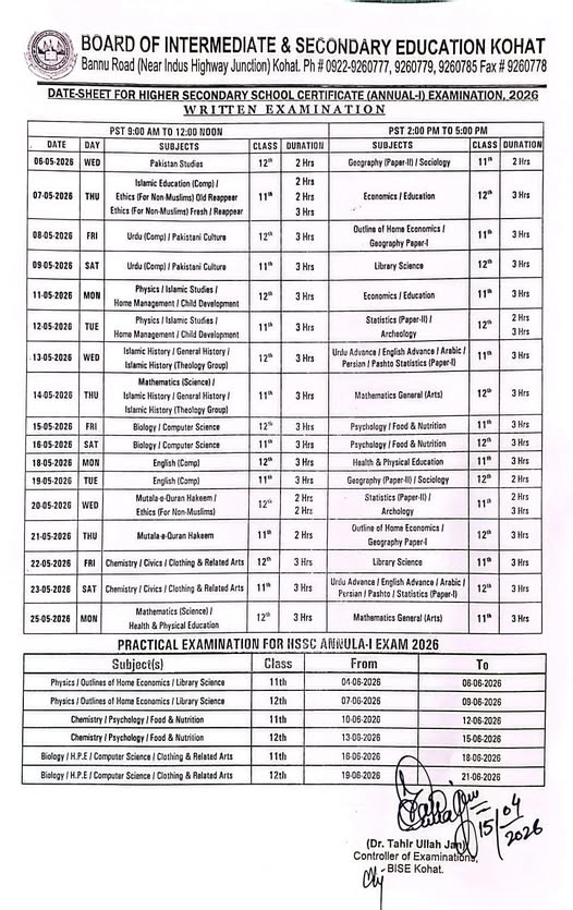 The Board of Intermediate and Secondary Education (BISE) Kohat has officially released the date sheet for the Higher Secondary School Certificate (HSSC) annual examinations for the year 2026. As per the newly issued schedule, the HSSC (11th & 12th) theory exams will commence on May 6th, 2026 , while the practical examinations are set to begin on June 4th, 2026 .