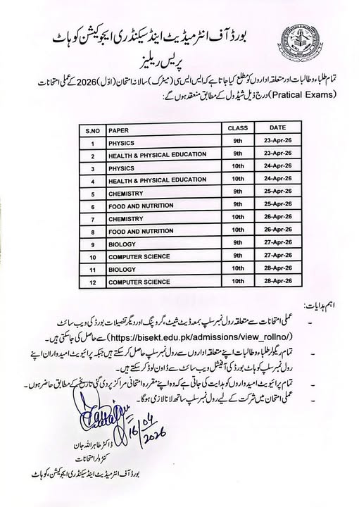 This announcement brings much-needed clarity to thousands of students across the Kohat division who have been eagerly awaiting the official exam calendar. While the HSSC practicals start in June, the BISE Kohat has also simultaneously released a separate schedule for Matric (9th & 10th) practical exams , which are slated to begin in April 23rd, 2026 .
