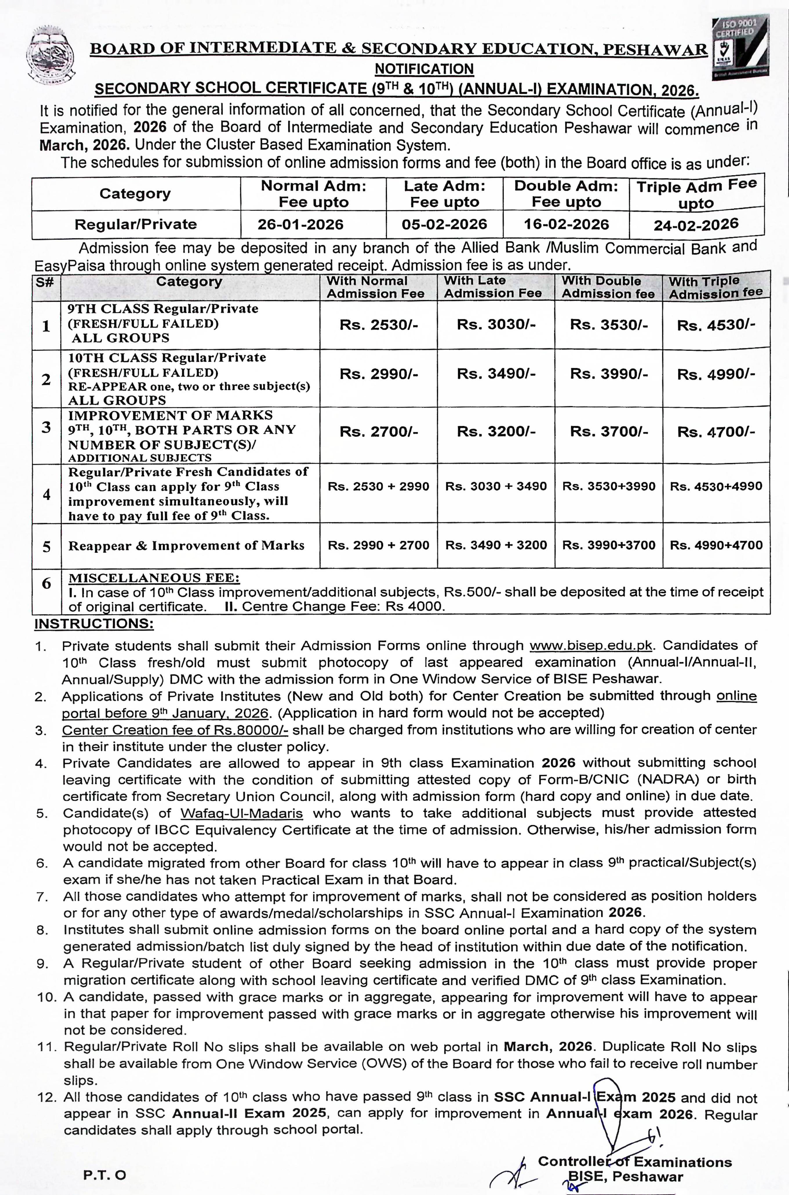 The Peshawar Board of Intermediate and Secondary Education (BISE Peshawar) has officially declared that the Matriculation (Secondary School Certificate) annual examinations for the year 2026 will commence on March 31st, 2026 . The official notification, issued by the board's authorities, marks a significant timeline for thousands of students across the province.