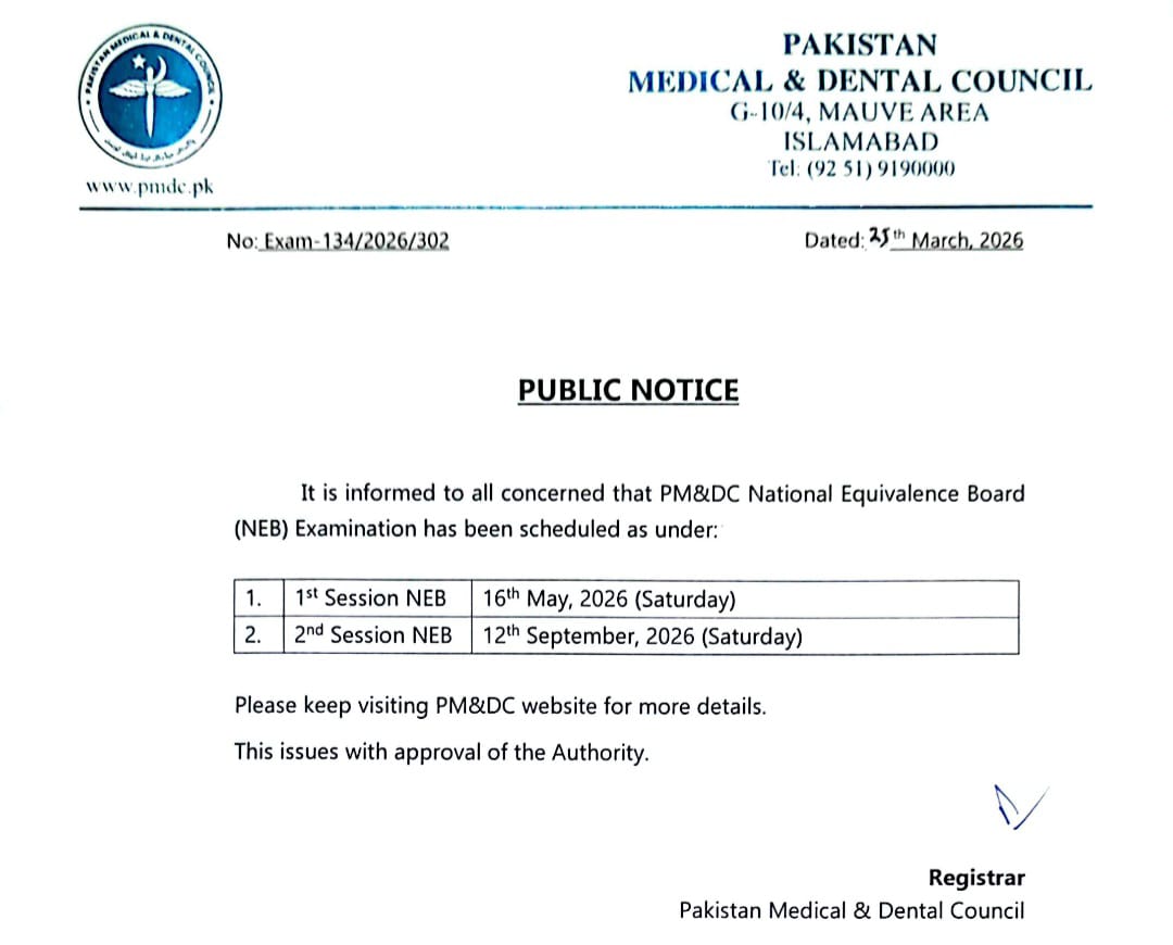 The Pakistan Medical and Dental Council (PMDC) has officially announced the date for the National Equivalence Board (NEB) examination . The high-stakes assessment, which validates foreign medical degrees for practice in Pakistan, will be held on May 16th, 2026 .
