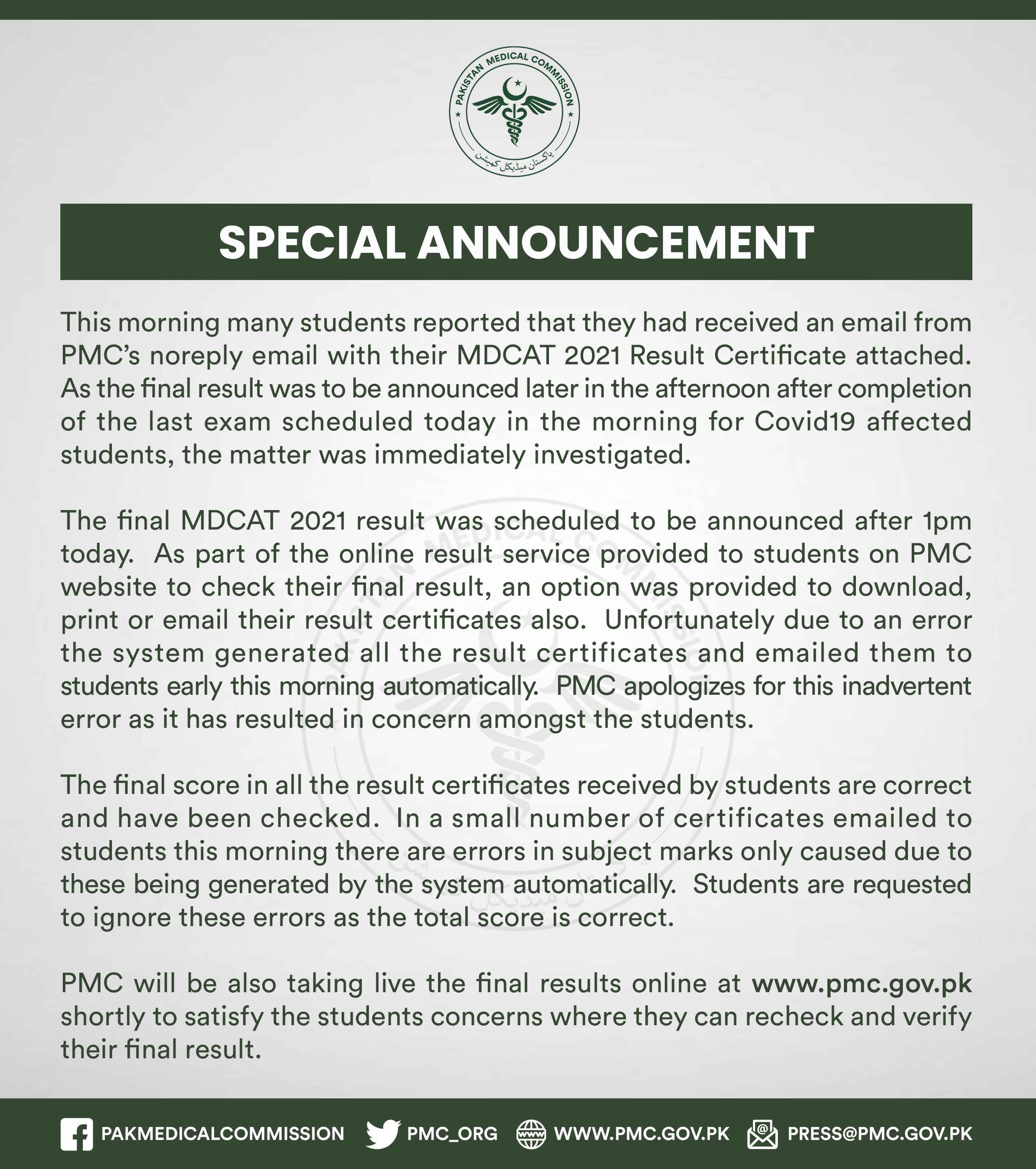 The Pakistan Medical Commission has made an important announcement regarding the MDCAT 2021 result. It has been said that the email has been sent to the students with the result certificates before the scheduled time of the result announcement due to an error in the system. The final MDCAT 2021 result was scheduled to be declared later on for the candidates who had appeared in the medical and dental college admission test. MDCAT is computer based test that was conducted by the Pakistan Medical Commission to select the candidates to get the admission in the medical and dental colleges.