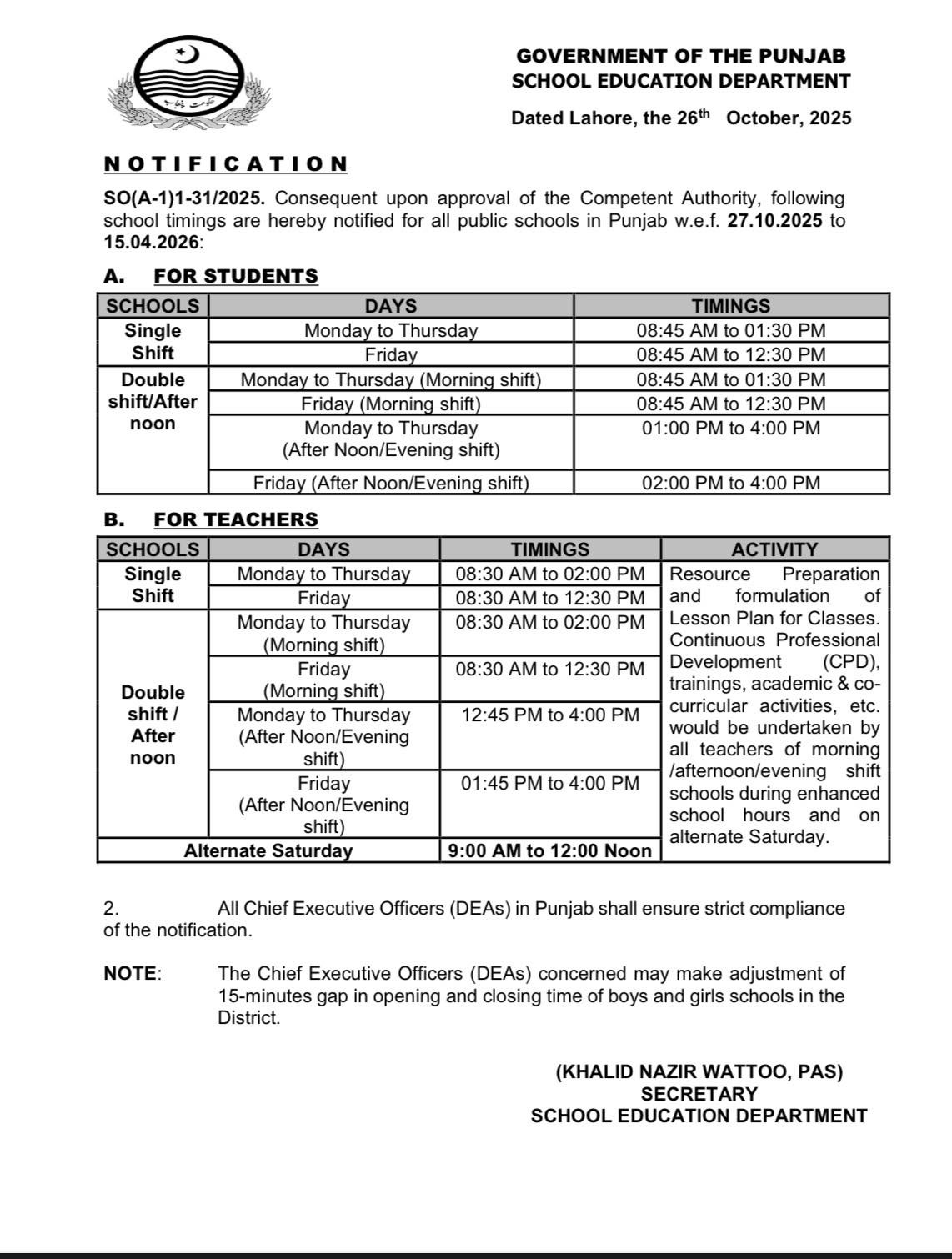 Secretary of the School Education Department, Khalid Nazir Wattoo (PAS), signed the notification and emphasized that all concerned authorities must ensure timely and strict enforcement of the revised schedule. He also highlighted the importance of professional development activities for teachers and effective utilization of school hours.