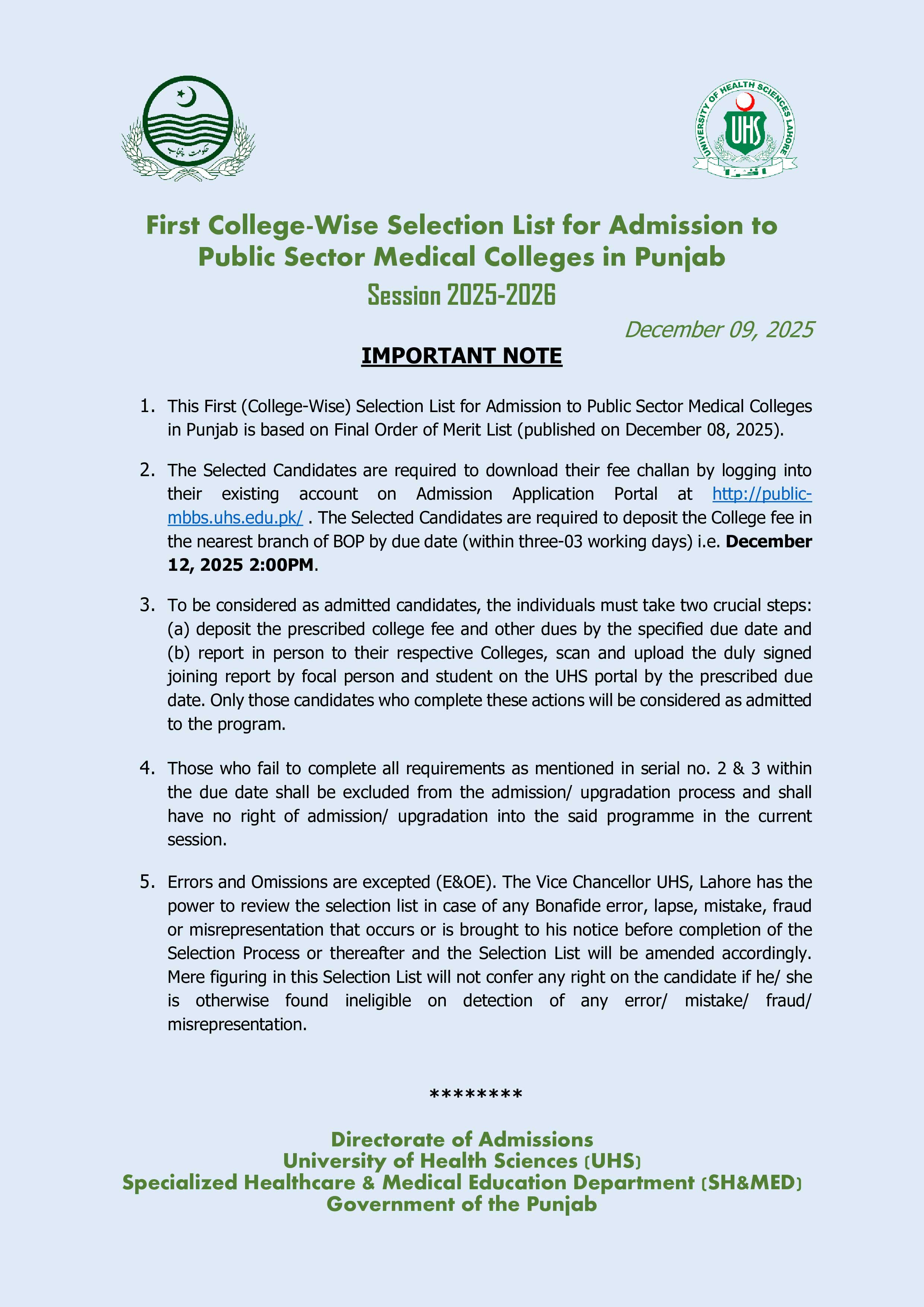 The University of Health Sciences (UHS) Lahore has officially released the MBBS first merit-based selection list for admissions to Government Medical and Dental Colleges across Punjab for the 2025-26 academic session . In a significant development for thousands of aspiring doctors, the overall minimum merit threshold for open merit seats in government medical colleges has seen a notable decrease compared to last year. Candidates can now view their allocated colleges and proceed with the admission formalities, with a strict deadline for fee submission and joining set for December 12th, 2025 .
