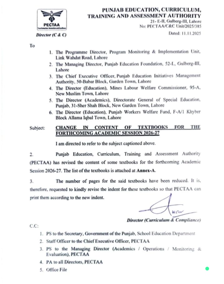 The directive, addressed to key officials including the Programme Director of the Program Monitoring & Implementation Unit (PMIU), the Managing Director of Punjab Education Foundation (PEF), and senior education officers across Punjab, highlights that the revised textbooks will feature fewer pages and updated content. Education institutions and printing authorities have been instructed to revise their indents accordingly to ensure timely printing and distribution before the new academic session begins in April 2026.