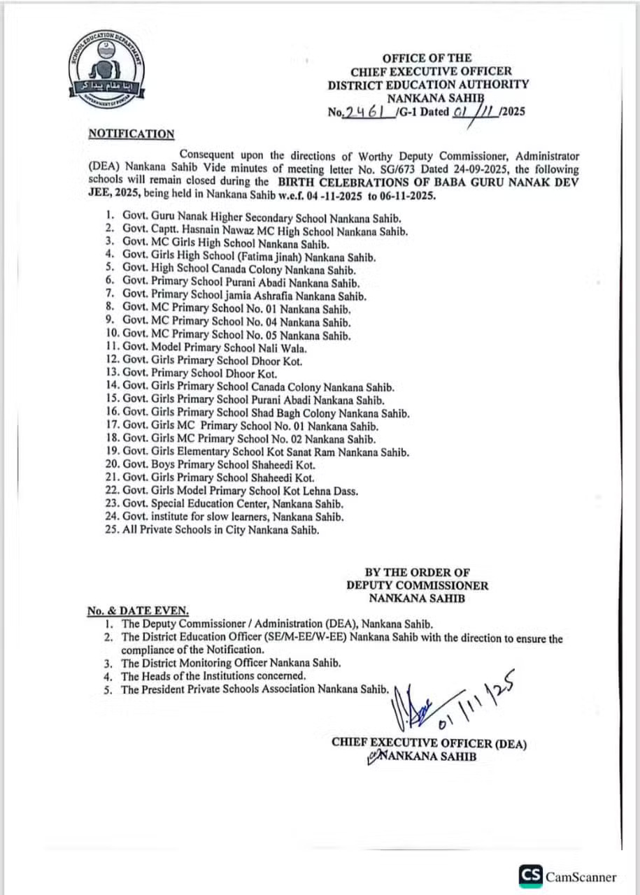 According to an official notification issued by the Chief Executive Officer (DEA) Nankana Sahib) on November 1, 2025, the three-day holidays will apply to 24 government schools and all private institutions operating within the city limits. The purpose of the closure is to facilitate pilgrims, ensure smooth management of religious activities, and maintain law and order during the celebrations.