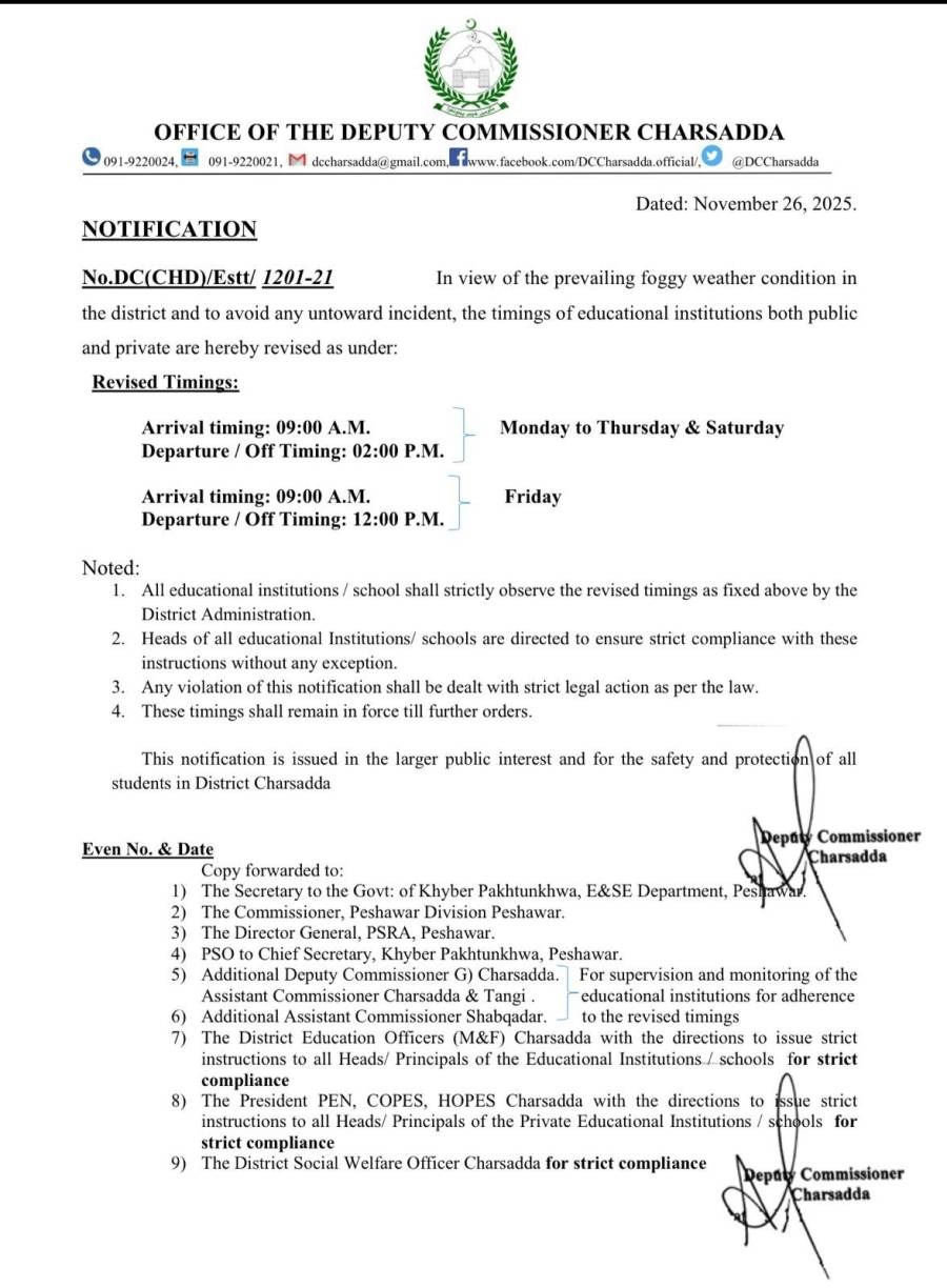 In an official statement, the Deputy Commissioner of Charsadda emphasized that the decision was made "in the public interest to protect the lives and property of the children." He further stated that the revised schedule would remain in effect until further notice, contingent upon improvements in visibility and weather conditions.