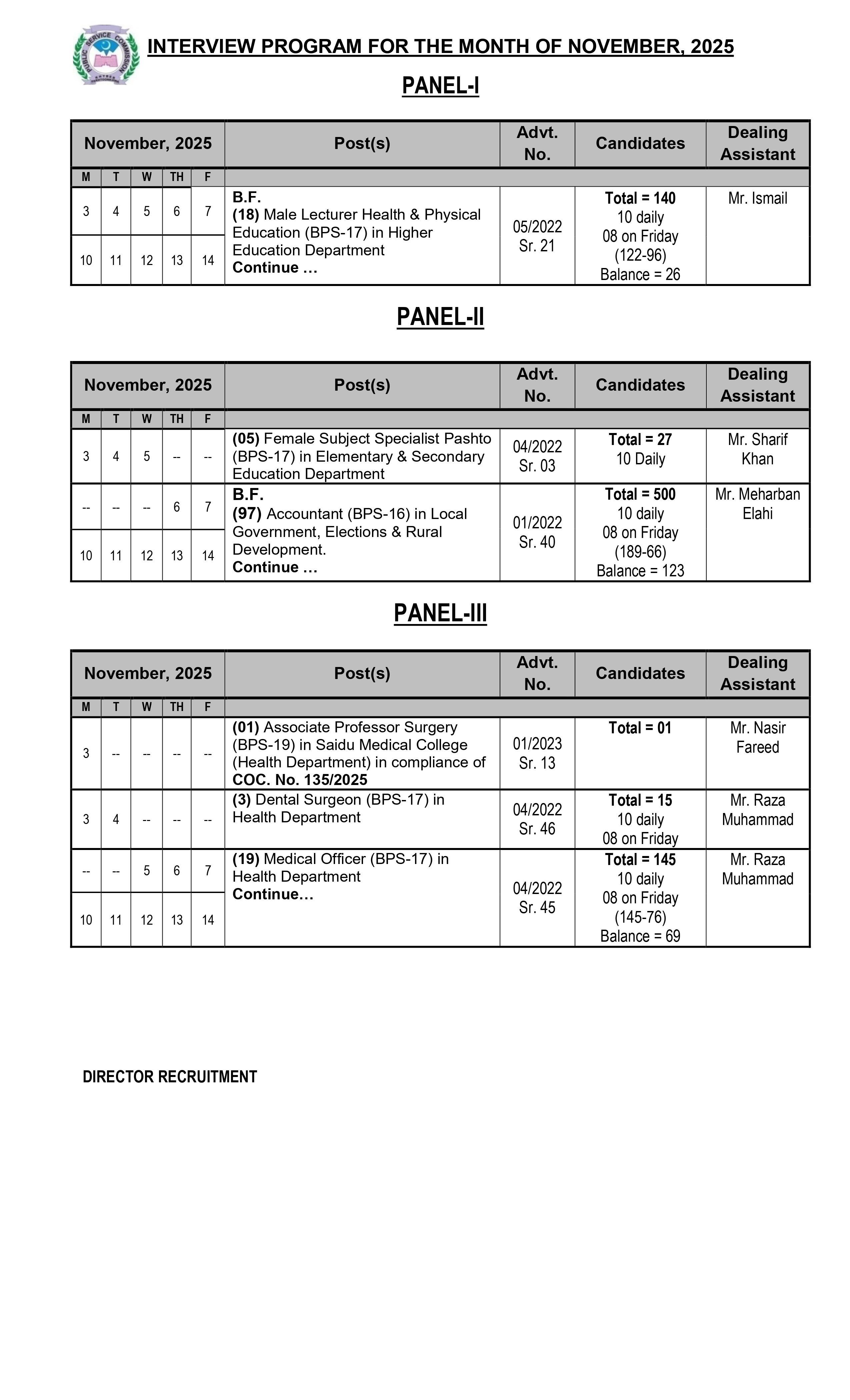 Interview Programme For The Month Of November, 2025 is also out by Khyber Pakhtunkhwa public Service Commission from advertisement 2025 for the following post. Details of the interview are mentioned in the PDF attached. Candidates are advised to view the interview schedule given below.