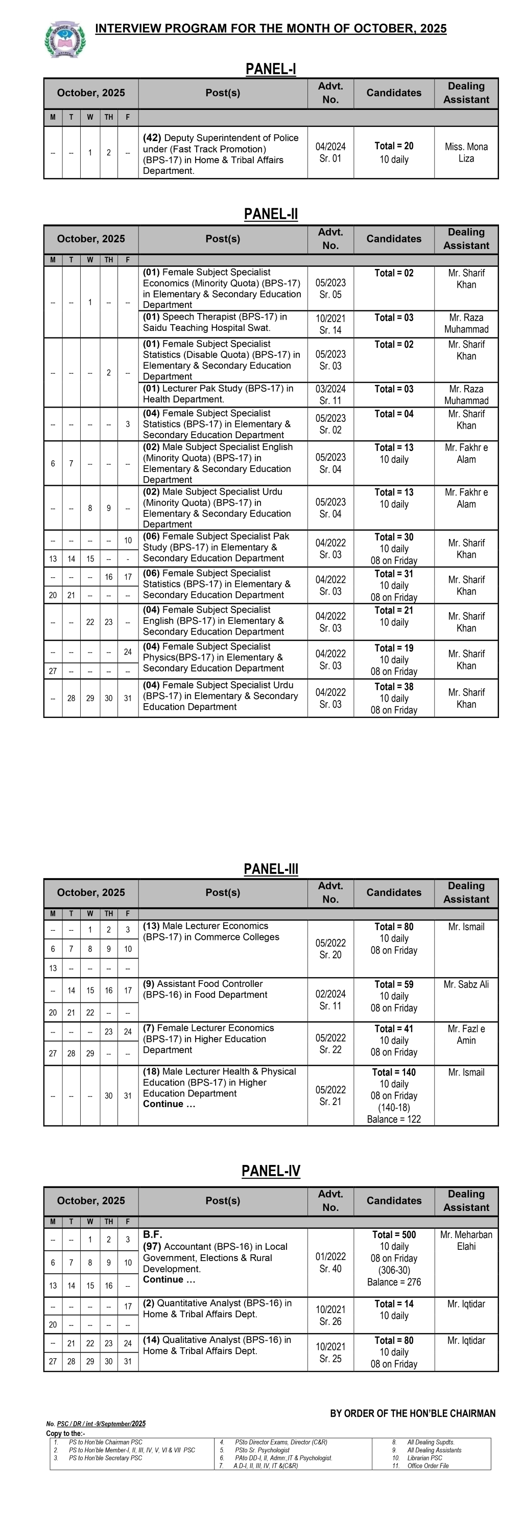 Interview Programme For The Month Of October, 2025 is also out by Khyber Pakhtunkhwa public Service Commission from advertisement 2025 for the following post. Details of the interview are mentioned in the PDF attached. Candidates are advised to view the interview schedule given below.