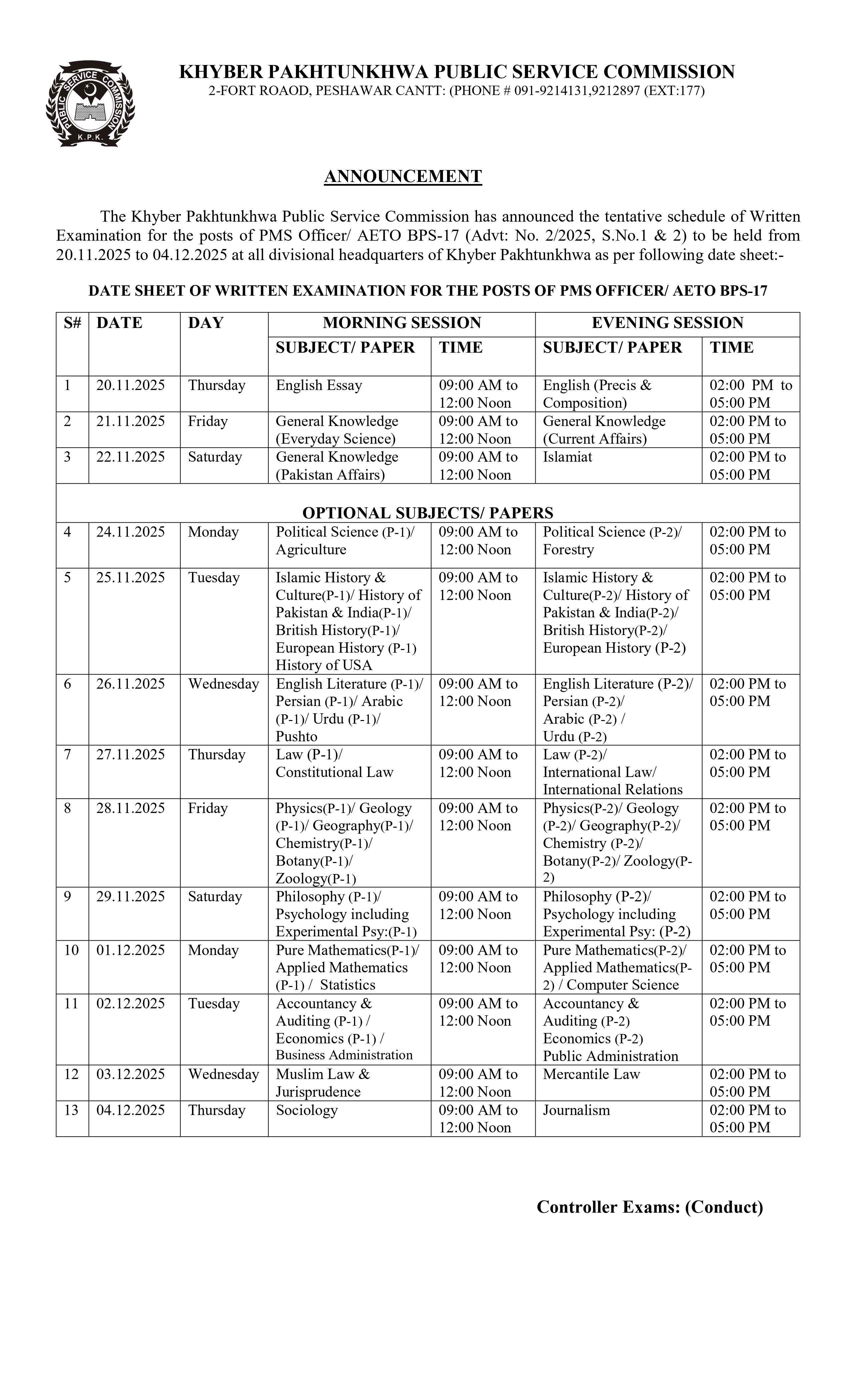 The Khyber Pakhtunkhwa Public Service Commission has announced the tentative schedule of Written Examination for the posts of PMS Officer/ AETO BPS-17 (Advt: No. 2/2025, S.No.1 & 2) to be held from November 20th, 2025 to December 4th, 2025 at all divisional headquarters of Khyber Pakhtunkhwa as per following date sheet: