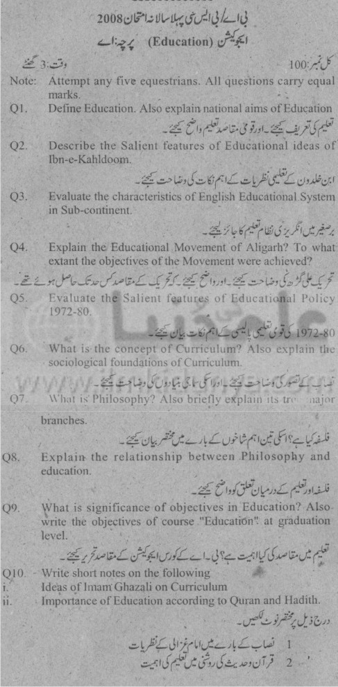 BA/BSc 1st Education Elective Paper A Sargodha University 2008