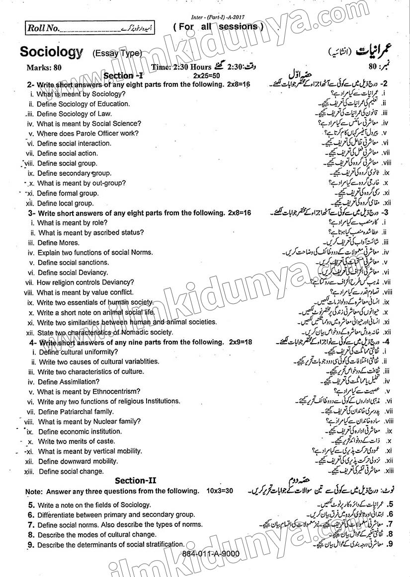 Past Paper 11th Class Rawalpindi Board Sociology Subjective Both 2017