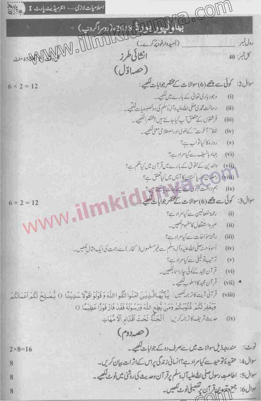 Past Paper 2018 Bahawalpur Board Inter Part 1 Islamiyat Group 2 Urdu Medium Subjective