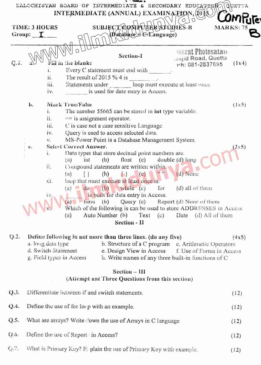 Past Papers 2015 Quetta Board FSc Part 2 Computer Studies