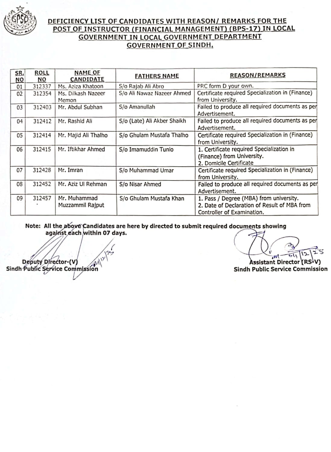 SPSC announced the list of deficient candidates for various post. The list of the deficient candidates are given below: