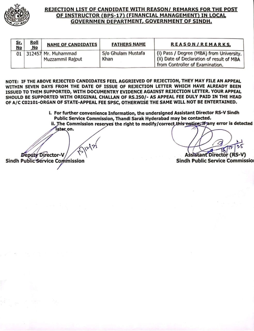 SPSC announced the rejection list for the post of Medical Officer BPS-17 from the department of health.