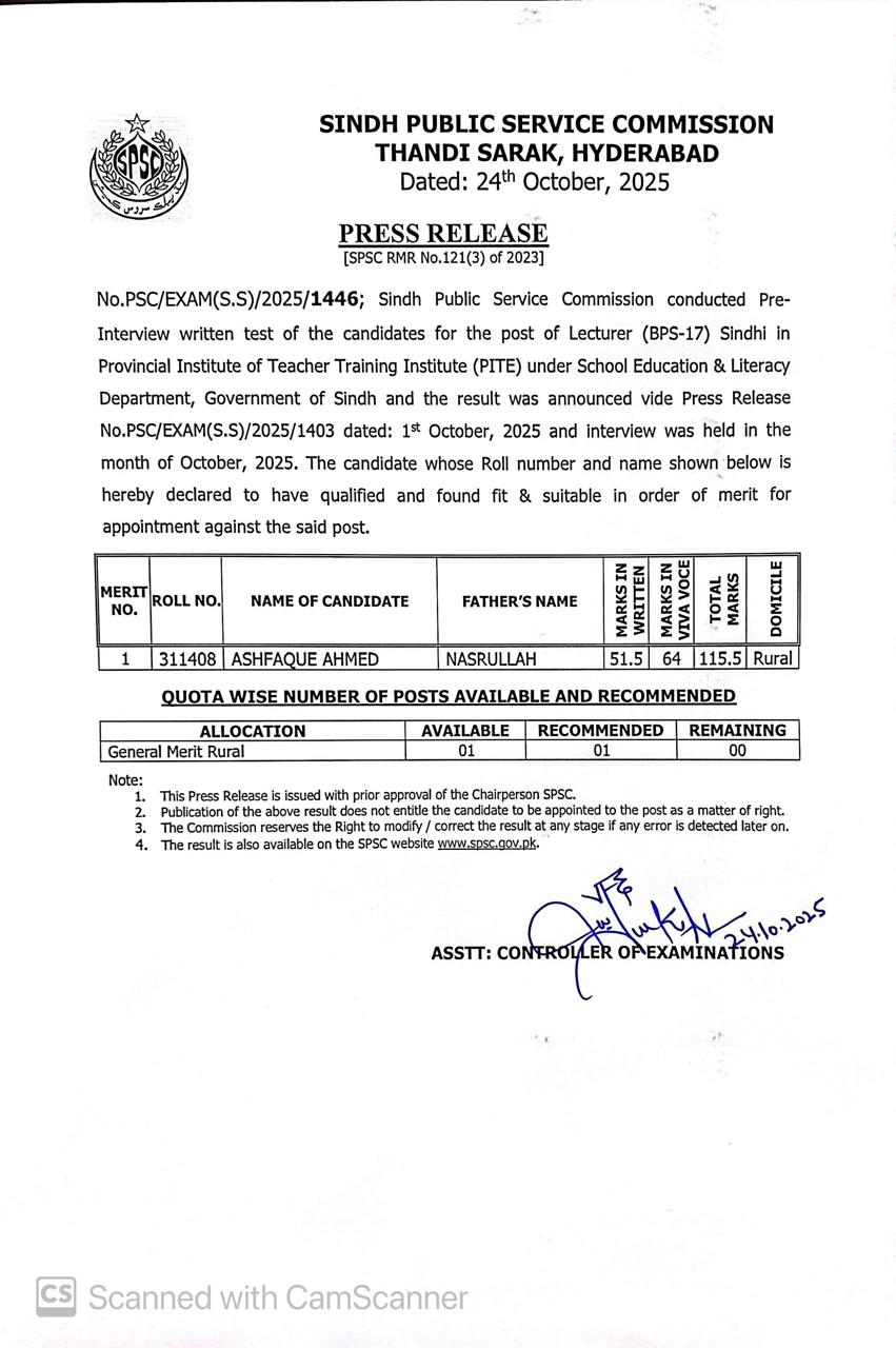 SPSC has announced the interview result of Lecturer Sindhi BPS-17 on October 27th, 2025. We wish to inform you that the Latest Update has been officially disclosed and is now accessible on this page. Here are essential details regarding the SPSC Result: