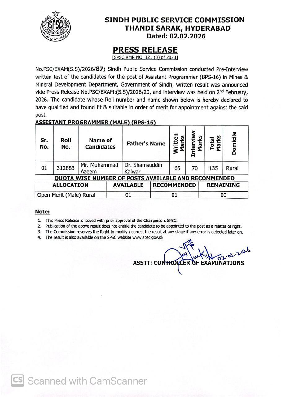 | Assistant Programmer (BS-16) | Mines & Mineral Development Department | 03-Feb-2026 | View/Download |